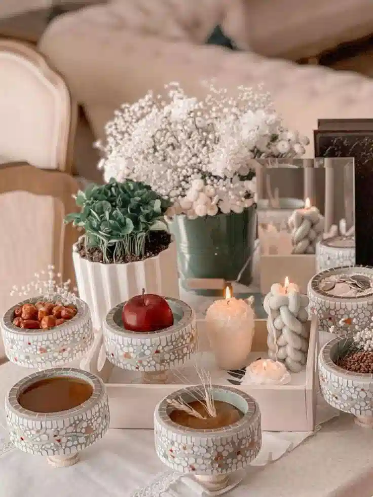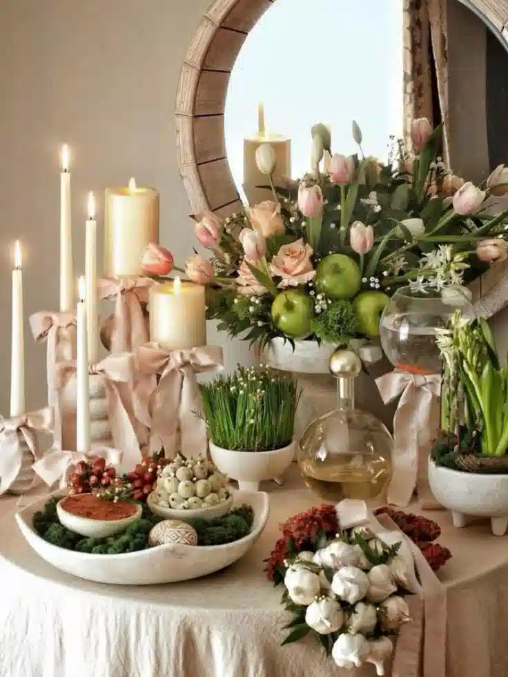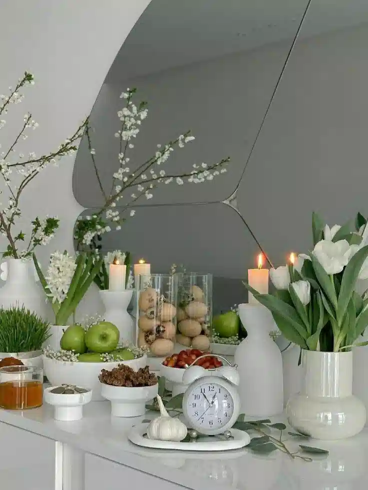 در تصاویر زیر، نمونههایی از تزیین هفت سین لاکچری را مشاهده میکنید که برای دکوراسیونهای مجلل و سالنهای پذیرایی بزرگ مانند کلینیکهای درمانی و سالنهای زیبایی مناسب هستند.