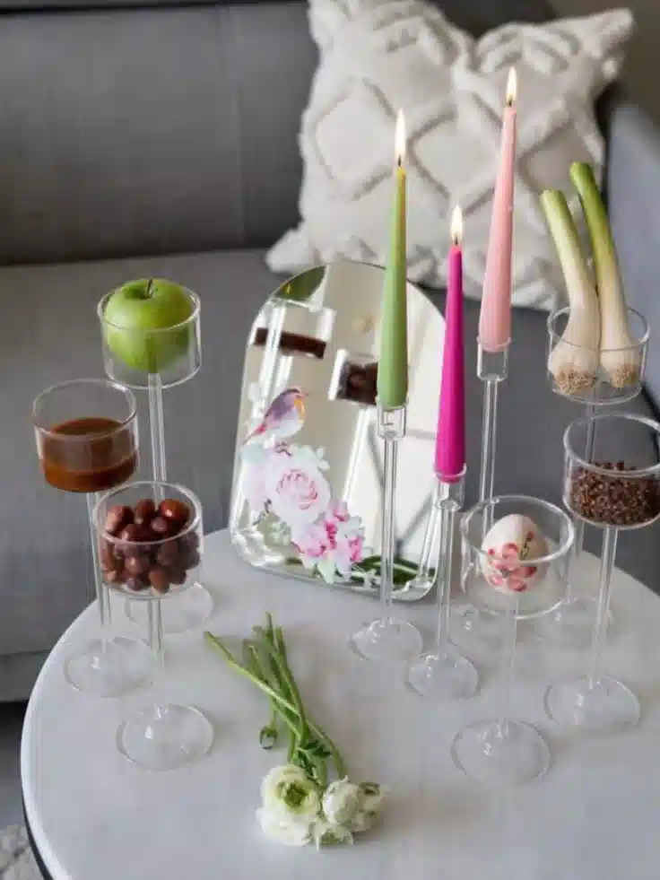 شمعدانهای طلایی و ظروف دکوری مجلل را سر سفره هفت سین قرار دهید