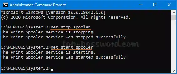 شما میتوانید از قسمت cmd یا دستورات خط فرمان سیستم (Command Prompt) نیز برای ریاستارت کردن سرویس پرینت اسپولر و پاک کردن حافظه موقت پرینتر استفاده کنید. برای این کار، دو دستور زیر را در cmd وارد کنید تا این سرویس کامل متوقف شود و سپس دوباره شروع به کار کند: