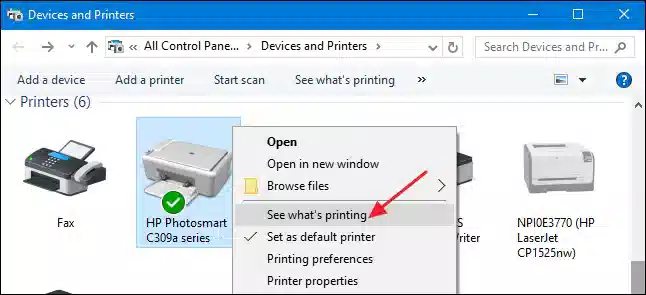 - حالا باید پرینتر اصلی خود را انتخاب کرده و روی آیکون پرینتر، کلیک راست کنید. سپس گزینه See what’s printing را بزنید تا فایلها و دستورهای پرینت را در صف چاپ مشاهده کنید. در بعضی از نسخهها، لازم است گزینه Open queue را بزنید تا بتوانید فایلهای داخل صف چاپ را مشاهده کنید.